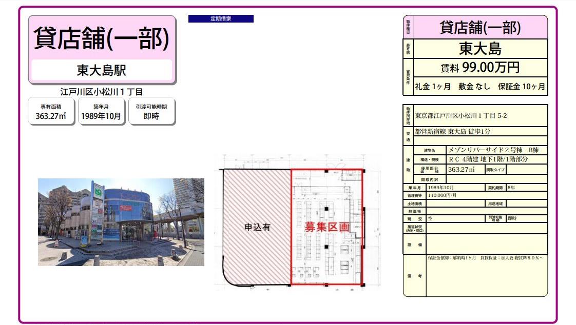 東京都江戸川区小松川1-5-2の賃貸事務所(貸事務所)・貸店舗をお探しのお客様へご案内-このたびは首都圏最大級、貸事務所・貸店舗専門ポータルサイトの東京オフィスMOVEをご利用いただき誠に有り難うございます。事務所移転、飲食店開業や新規独立まで賃貸事務所・賃貸オフィス・貸店舗の仲介実績豊富なスタッフがフルサポート致します。東京都江戸川区小松川1-5-2の大型駐車場付貸事務所、重飲食、美容院や居抜き店舗、レンタルオフィスまで貸事務所(賃貸事務所)、貸店舗を簡単に検索できます!東京都江戸川区小松川1-5-2でSOHO、賃貸オフィス、一棟ビルの貸事務所の貸主・オーナー様には無料にて広告掲載いたしますので是非、お問い合わせください。その他、東京都江戸川区小松川1-5-2で貸事務所・貸店舗をお探しのテナント様にはフリーレント、引越しサービスやオフィスレイアウトもアドバイス出来ますのでご相談ください。 |