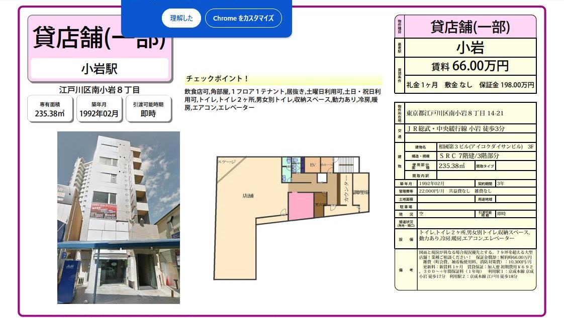 東京都江戸川区南小岩8-14-21の賃貸事務所(貸事務所)・貸店舗をお探しのお客様へご案内-このたびは首都圏最大級、貸事務所・貸店舗専門ポータルサイトの東京オフィスMOVEをご利用いただき誠に有り難うございます。事務所移転、飲食店開業や新規独立まで賃貸事務所・賃貸オフィス・貸店舗の仲介実績豊富なスタッフがフルサポート致します。東京都江戸川区南小岩8-14-21の大型駐車場付貸事務所、重飲食、美容院や居抜き店舗、レンタルオフィスまで貸事務所(賃貸事務所)、貸店舗を簡単に検索できます!東京都江戸川区南小岩8-14-21でSOHO、賃貸オフィス、一棟ビルの貸事務所の貸主・オーナー様には無料にて広告掲載いたしますので是非、お問い合わせください。その他、東京都江戸川区南小岩8-14-21で貸事務所・貸店舗をお探しのテナント様にはフリーレント、引越しサービスやオフィスレイアウトもアドバイス出来ますのでご相談ください。 |