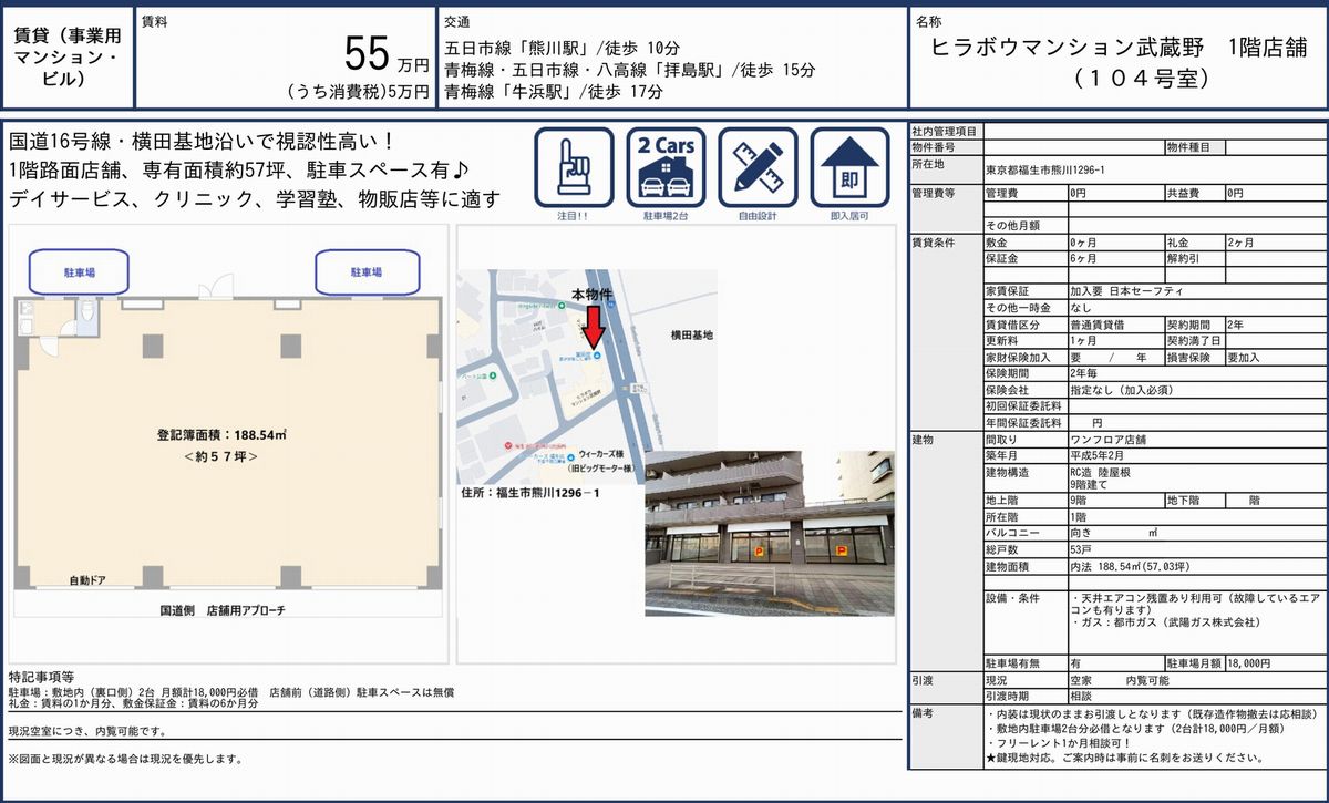 東京都福生市大字熊川1296-1の賃貸事務所(貸事務所)・貸店舗をお探しのお客様へご案内-このたびは首都圏最大級、貸事務所・貸店舗専門ポータルサイトの東京オフィスMOVEをご利用いただき誠に有り難うございます。事務所移転、飲食店開業や新規独立まで賃貸事務所・賃貸オフィス・貸店舗の仲介実績豊富なスタッフがフルサポート致します。東京都福生市大字熊川1296-1の大型駐車場付貸事務所、重飲食、美容院や居抜き店舗、レンタルオフィスまで貸事務所(賃貸事務所)、貸店舗を簡単に検索できます!東京都福生市大字熊川1296-1でSOHO、賃貸オフィス、一棟ビルの貸事務所の貸主・オーナー様には無料にて広告掲載いたしますので是非、お問い合わせください。その他、東京都福生市大字熊川1296-1で貸事務所・貸店舗をお探しのテナント様にはフリーレント、引越しサービスやオフィスレイアウトもアドバイス出来ますのでご相談ください。 |