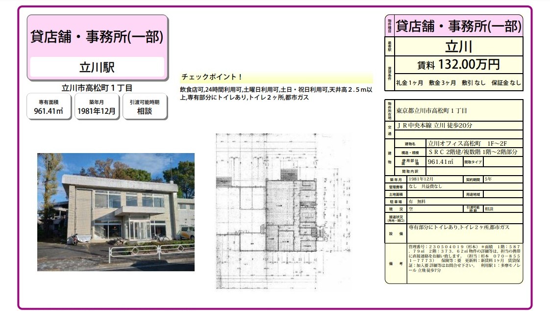 | 備考 | 飲食店可24時間利用可土曜日利用可土日・祝日利用可天井高2.5m以上 条件交渉ご相談ください。 |