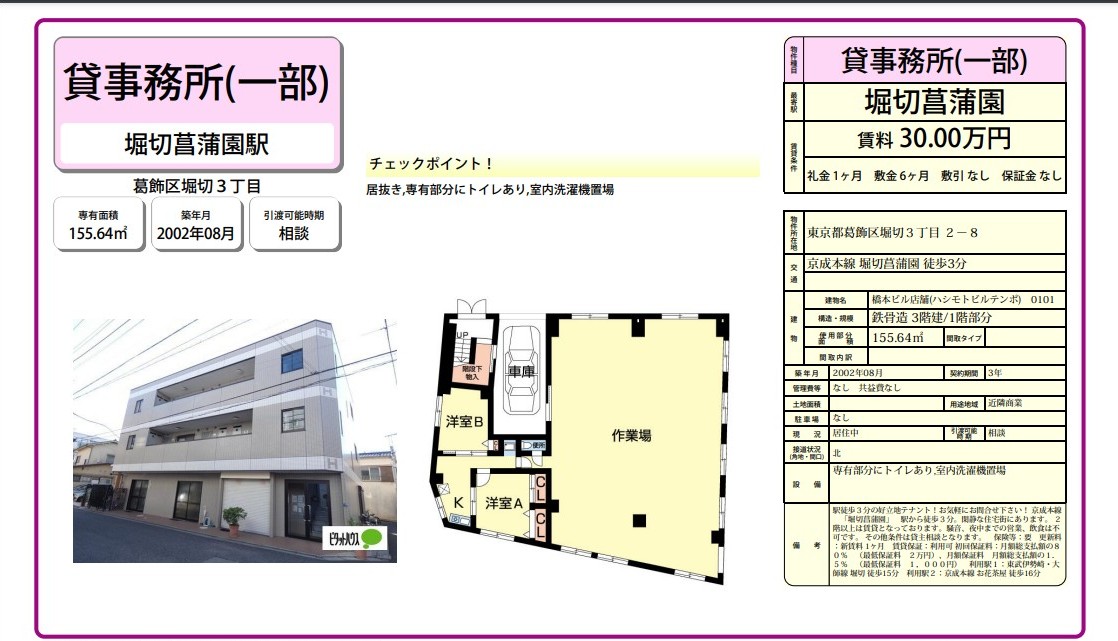東京都葛飾区堀切3-2-8の賃貸事務所(貸事務所)・貸店舗をお探しのお客様へご案内-このたびは首都圏最大級、貸事務所・貸店舗専門ポータルサイトの東京オフィスMOVEをご利用いただき誠に有り難うございます。事務所移転、飲食店開業や新規独立まで賃貸事務所・賃貸オフィス・貸店舗の仲介実績豊富なスタッフがフルサポート致します。東京都葛飾区堀切3-2-8の大型駐車場付貸事務所、重飲食、美容院や居抜き店舗、レンタルオフィスまで貸事務所(賃貸事務所)、貸店舗を簡単に検索できます!東京都葛飾区堀切3-2-8でSOHO、賃貸オフィス、一棟ビルの貸事務所の貸主・オーナー様には無料にて広告掲載いたしますので是非、お問い合わせください。その他、東京都葛飾区堀切3-2-8で貸事務所・貸店舗をお探しのテナント様にはフリーレント、引越しサービスやオフィスレイアウトもアドバイス出来ますのでご相談ください。 |