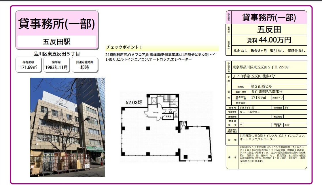 東京都品川区東五反田5-22-38の賃貸事務所(貸事務所)・貸店舗をお探しのお客様へご案内-このたびは首都圏最大級、貸事務所・貸店舗専門ポータルサイトの東京オフィスMOVEをご利用いただき誠に有り難うございます。事務所移転、飲食店開業や新規独立まで賃貸事務所・賃貸オフィス・貸店舗の仲介実績豊富なスタッフがフルサポート致します。東京都品川区東五反田5-22-38の大型駐車場付貸事務所、重飲食、美容院や居抜き店舗、レンタルオフィスまで貸事務所(賃貸事務所)、貸店舗を簡単に検索できます!東京都品川区東五反田5-22-38でSOHO、賃貸オフィス、一棟ビルの貸事務所の貸主・オーナー様には無料にて広告掲載いたしますので是非、お問い合わせください。その他、東京都品川区東五反田5-22-38で貸事務所・貸店舗をお探しのテナント様にはフリーレント、引越しサービスやオフィスレイアウトもアドバイス出来ますのでご相談ください。 |