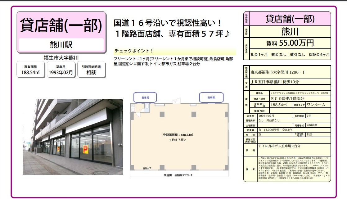 トイレ都市ガス駐車場2台分 ・内装は現状のままお引渡しとなります。(既存造作物撤去は応相談)・天井エアコン残置物有り(一部故障しているエアコンもあります)・建物裏口側に敷地内駐車場2台有、必借となります(月額賃料18000円2台計)・飲食店は軽飲食に限る。その他は応相談となります。・フリーレント1か月まで相談可能。・国道側店舗前アプローチには自転車駐輪可(自動車・バイクは不可)・鍵は現地設置。ご案内時は事前に名刺をお送りください。