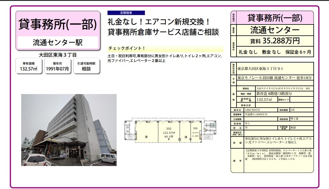東京都大田区東海3-9-1の賃貸事務所(貸事務所)・貸店舗をお探しのお客様へご案内-このたびは首都圏最大級、貸事務所・貸店舗専門ポータルサイトの東京オフィスMOVEをご利用いただき誠に有り難うございます。事務所移転、飲食店開業や新規独立まで賃貸事務所・賃貸オフィス・貸店舗の仲介実績豊富なスタッフがフルサポート致します。東京都大田区東海3-9-1の大型駐車場付貸事務所、重飲食、美容院や居抜き店舗、レンタルオフィスまで貸事務所(賃貸事務所)、貸店舗を簡単に検索できます!東京都大田区東海3-9-1でSOHO、賃貸オフィス、一棟ビルの貸事務所の貸主・オーナー様には無料にて広告掲載いたしますので是非、お問い合わせください。その他、東京都大田区東海3-9-1で貸事務所・貸店舗をお探しのテナント様にはフリーレント、引越しサービスやオフィスレイアウトもアドバイス出来ますのでご相談ください。 |