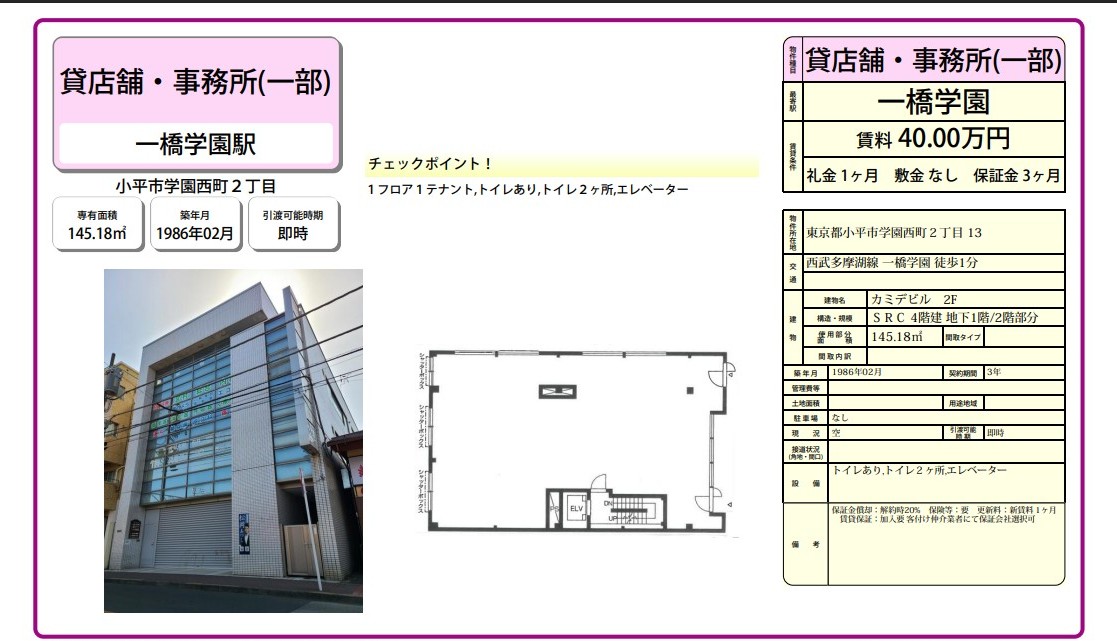 東京都小平市学園西町2-13の賃貸事務所(貸事務所)・貸店舗をお探しのお客様へご案内-このたびは首都圏最大級、貸事務所・貸店舗専門ポータルサイトの東京オフィスMOVEをご利用いただき誠に有り難うございます。事務所移転、飲食店開業や新規独立まで賃貸事務所・賃貸オフィス・貸店舗の仲介実績豊富なスタッフがフルサポート致します。東京都小平市学園西町2-13の大型駐車場付貸事務所、重飲食、美容院や居抜き店舗、レンタルオフィスまで貸事務所(賃貸事務所)、貸店舗を簡単に検索できます!東京都小平市学園西町2-13でSOHO、賃貸オフィス、一棟ビルの貸事務所の貸主・オーナー様には無料にて広告掲載いたしますので是非、お問い合わせください。その他、東京都小平市学園西町2-13で貸事務所・貸店舗をお探しのテナント様にはフリーレント、引越しサービスやオフィスレイアウトもアドバイス出来ますのでご相談ください。 |