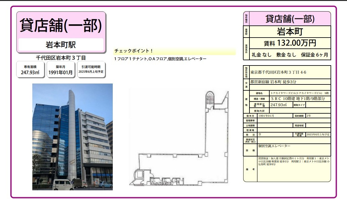 東京都千代田区岩本町3-4-6の賃貸事務所(貸事務所)・貸店舗をお探しのお客様へご案内-このたびは首都圏最大級、貸事務所・貸店舗専門ポータルサイトの東京オフィスMOVEをご利用いただき誠に有り難うございます。事務所移転、飲食店開業や新規独立まで賃貸事務所・賃貸オフィス・貸店舗の仲介実績豊富なスタッフがフルサポート致します。東京都千代田区岩本町3-4-6の大型駐車場付貸事務所、重飲食、美容院や居抜き店舗、レンタルオフィスまで貸事務所(賃貸事務所)、貸店舗を簡単に検索できます!東京都千代田区岩本町3-4-6でSOHO、賃貸オフィス、一棟ビルの貸事務所の貸主・オーナー様には無料にて広告掲載いたしますので是非、お問い合わせください。その他、東京都千代田区岩本町3-4-6で貸事務所・貸店舗をお探しのテナント様にはフリーレント、引越しサービスやオフィスレイアウトもアドバイス出来ますのでご相談ください。 |
