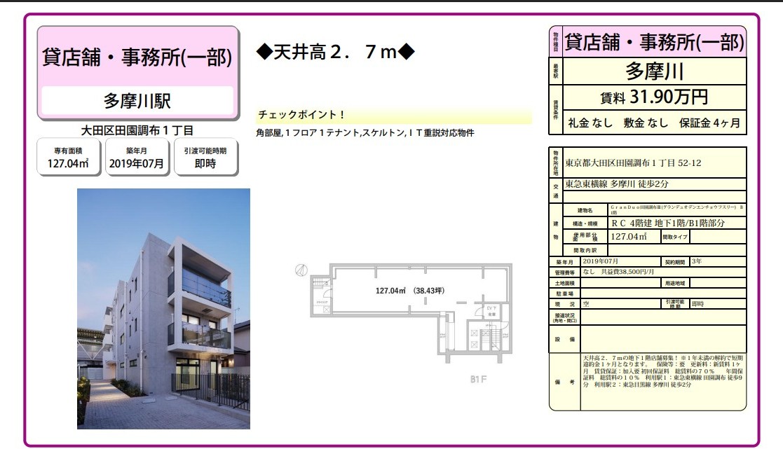 | 備考 | 角部屋1フロア1テナントスケルトンIT重説対応物件 条件交渉ご相談ください。 |