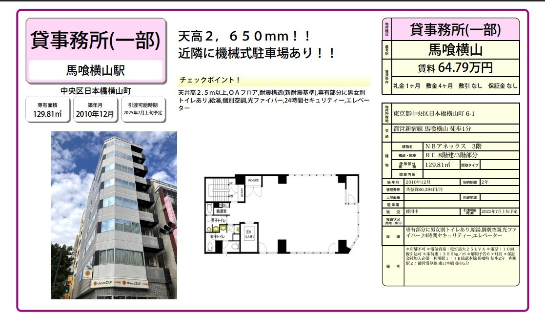 | 備考 | 天井高2.5m以上OAフロア耐震構造(新耐震基準) 条件交渉ご相談ください。 |