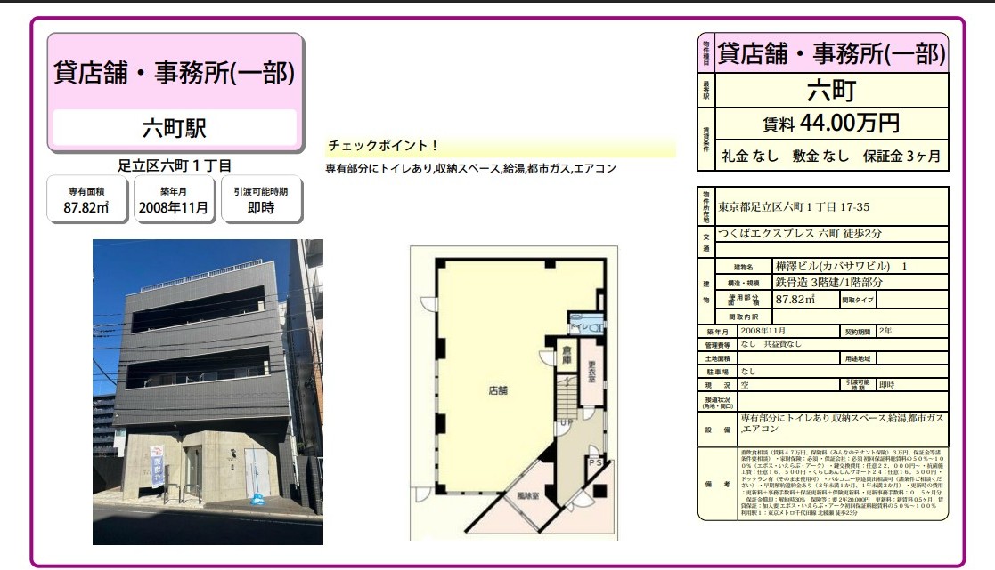 東京都足立区六町1-17-35の賃貸事務所(貸事務所)・貸店舗をお探しのお客様へご案内-このたびは首都圏最大級、貸事務所・貸店舗専門ポータルサイトの東京オフィスMOVEをご利用いただき誠に有り難うございます。事務所移転、飲食店開業や新規独立まで賃貸事務所・賃貸オフィス・貸店舗の仲介実績豊富なスタッフがフルサポート致します。東京都足立区六町1-17-35の大型駐車場付貸事務所、重飲食、美容院や居抜き店舗、レンタルオフィスまで貸事務所(賃貸事務所)、貸店舗を簡単に検索できます!東京都足立区六町1-17-35でSOHO、賃貸オフィス、一棟ビルの貸事務所の貸主・オーナー様には無料にて広告掲載いたしますので是非、お問い合わせください。その他、東京都足立区六町1-17-35で貸事務所・貸店舗をお探しのテナント様にはフリーレント、引越しサービスやオフィスレイアウトもアドバイス出来ますのでご相談ください。 |