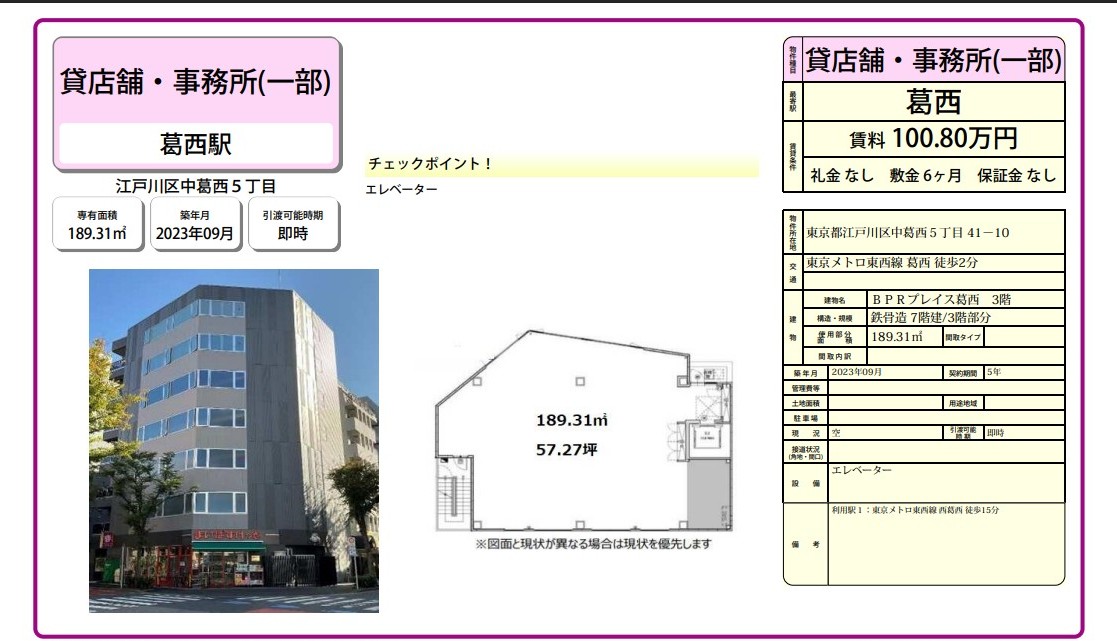 東京都江戸川区中葛西5-41-10の賃貸事務所(貸事務所)・貸店舗をお探しのお客様へご案内-このたびは首都圏最大級、貸事務所・貸店舗専門ポータルサイトの東京オフィスMOVEをご利用いただき誠に有り難うございます。事務所移転、飲食店開業や新規独立まで賃貸事務所・賃貸オフィス・貸店舗の仲介実績豊富なスタッフがフルサポート致します。東京都江戸川区中葛西5-41-10の大型駐車場付貸事務所、重飲食、美容院や居抜き店舗、レンタルオフィスまで貸事務所(賃貸事務所)、貸店舗を簡単に検索できます!東京都江戸川区中葛西5-41-10でSOHO、賃貸オフィス、一棟ビルの貸事務所の貸主・オーナー様には無料にて広告掲載いたしますので是非、お問い合わせください。その他、東京都江戸川区中葛西5-41-10で貸事務所・貸店舗をお探しのテナント様にはフリーレント、引越しサービスやオフィスレイアウトもアドバイス出来ますのでご相談ください。 |