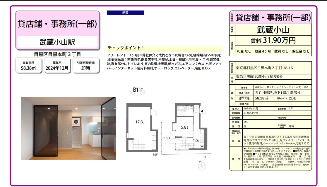 備考 飲食店不可角部屋土日・祝日利用可 条件交渉ご相談ください。