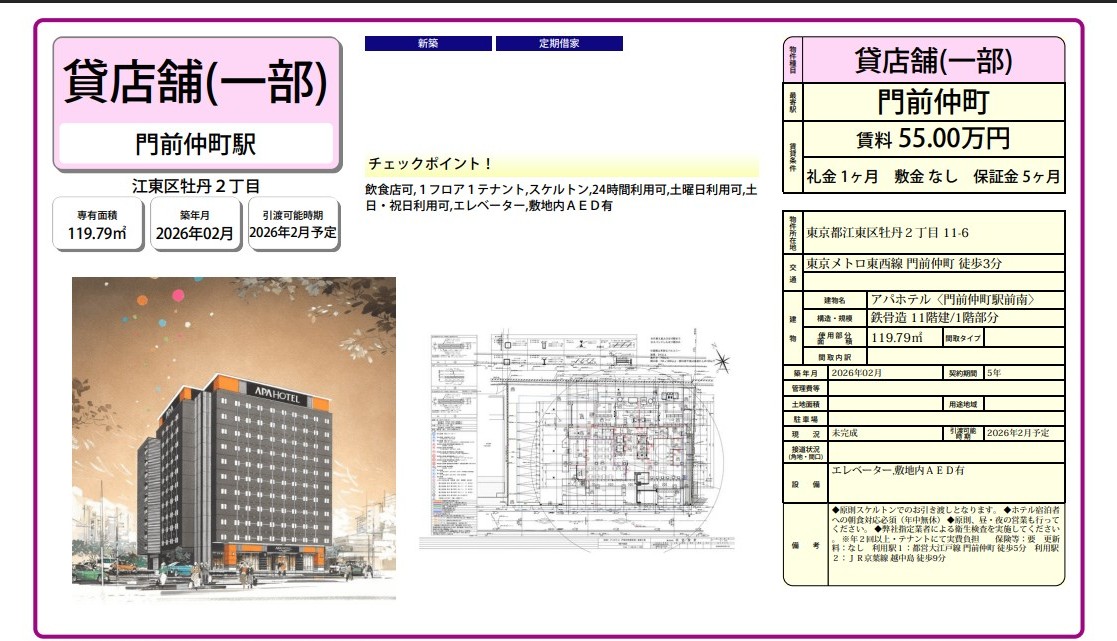 | 備考 | 飲食店可1フロア1テナントスケルトン24時間利用可土曜日利用可土日・祝日利用可 条件交渉ご相談ください。 |