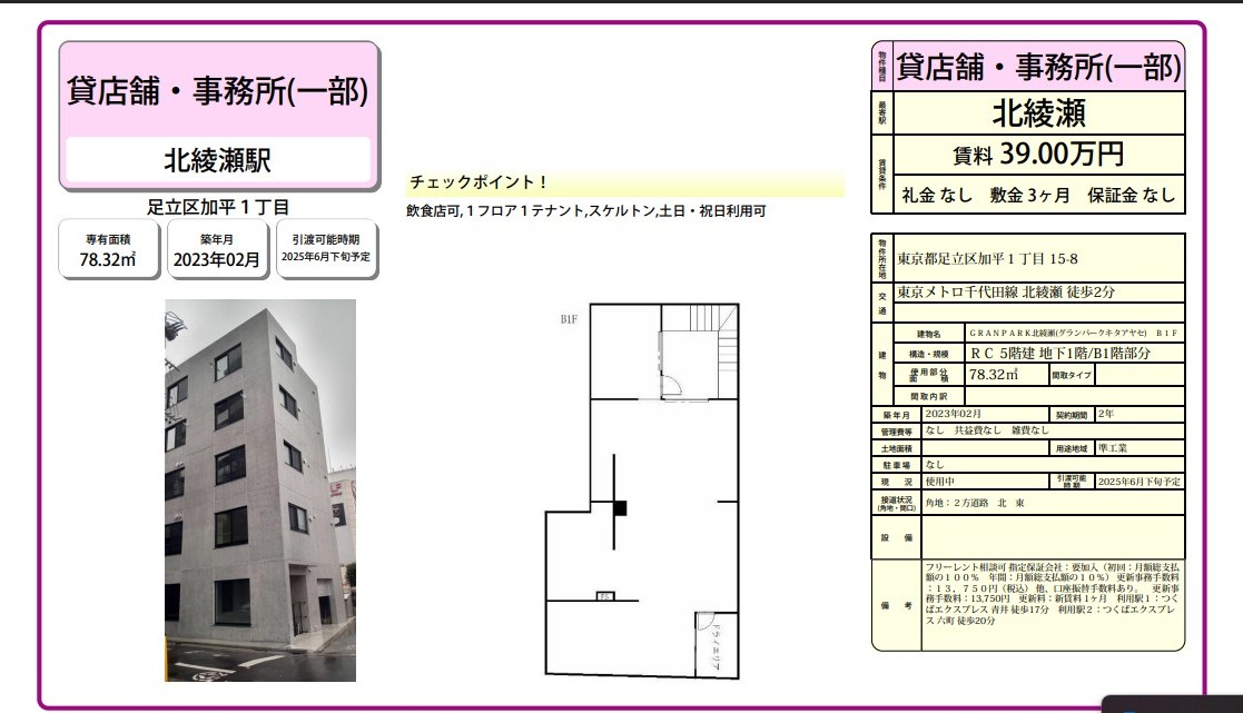 | 備考 | 飲食店可1フロア1テナントスケルトン土日・祝日利用可 条件交渉ご相談ください。 |