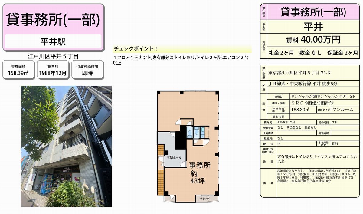 東京都江戸川区平井5-31-3の賃貸事務所(貸事務所)・貸店舗をお探しのお客様へご案内-このたびは首都圏最大級、貸事務所・貸店舗専門ポータルサイトの東京オフィスMOVEをご利用いただき誠に有り難うございます。事務所移転、飲食店開業や新規独立まで賃貸事務所・賃貸オフィス・貸店舗の仲介実績豊富なスタッフがフルサポート致します。東京都江戸川区平井5-31-3の大型駐車場付貸事務所、重飲食、美容院や居抜き店舗、レンタルオフィスまで貸事務所(賃貸事務所)、貸店舗を簡単に検索できます!東京都江戸川区平井5-31-3でSOHO、賃貸オフィス、一棟ビルの貸事務所の貸主・オーナー様には無料にて広告掲載いたしますので是非、お問い合わせください。その他、東京都江戸川区平井5-31-3で貸事務所・貸店舗をお探しのテナント様にはフリーレント、引越しサービスやオフィスレイアウトもアドバイス出来ますのでご相談ください。