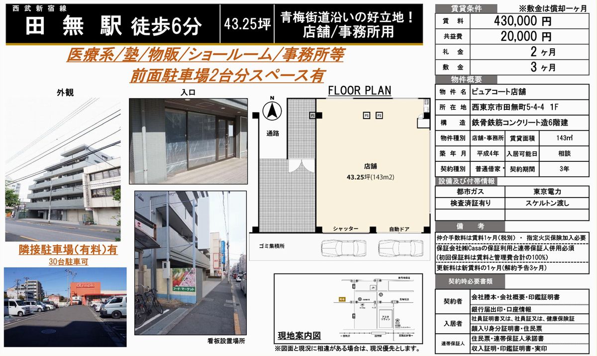 東京都西東京市田無町5-4-4の賃貸事務所(貸事務所)・貸店舗をお探しのお客様へご案内-このたびは首都圏最大級、貸事務所・貸店舗専門ポータルサイトの東京オフィスMOVEをご利用いただき誠に有り難うございます。事務所移転、飲食店開業や新規独立まで賃貸事務所・賃貸オフィス・貸店舗の仲介実績豊富なスタッフがフルサポート致します。東京都西東京市田無町5-4-4の大型駐車場付貸事務所、重飲食、美容院や居抜き店舗、レンタルオフィスまで貸事務所(賃貸事務所)、貸店舗を簡単に検索できます!東京都西東京市田無町5-4-4でSOHO、賃貸オフィス、一棟ビルの貸事務所の貸主・オーナー様には無料にて広告掲載いたしますので是非、お問い合わせください。その他、東京都西東京市田無町5-4-4で貸事務所・貸店舗をお探しのテナント様にはフリーレント、引越しサービスやオフィスレイアウトもアドバイス出来ますのでご相談ください。 |