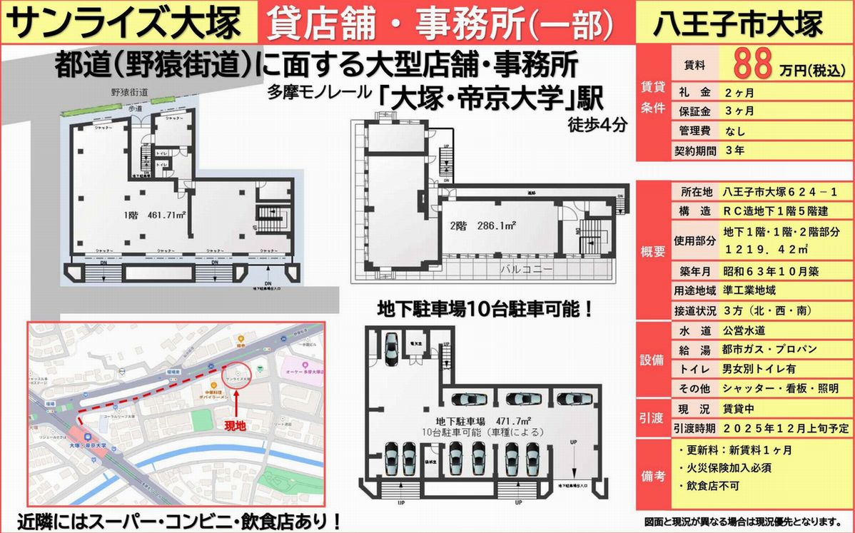 | 備考 | 地下駐車場10台分有 男女別トイレ |