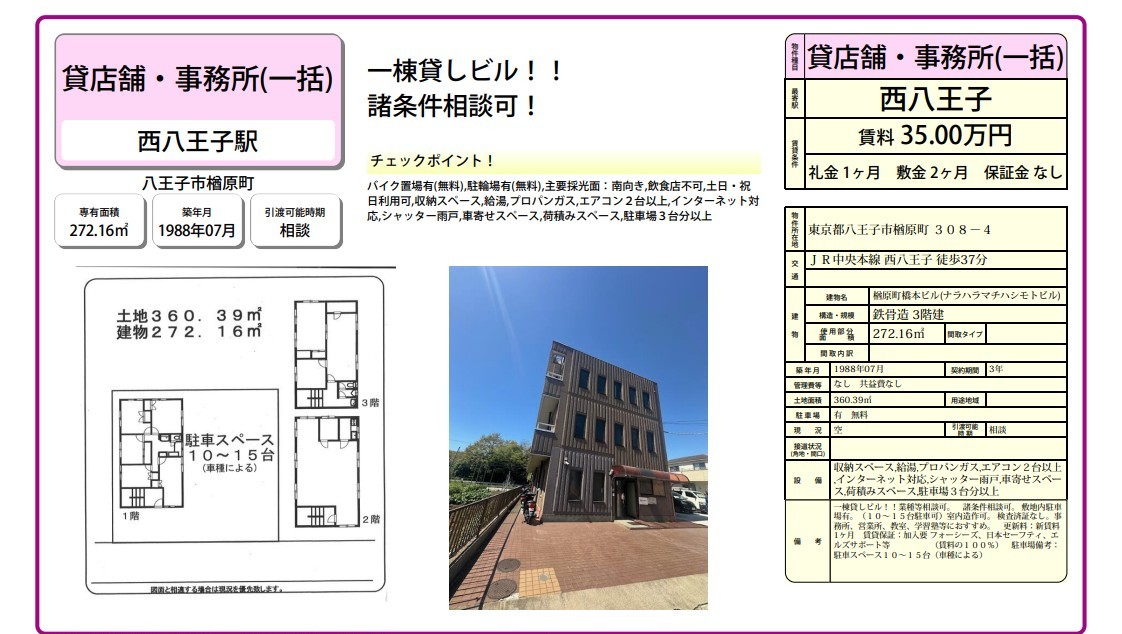 東京都八王子市楢原町308-4の賃貸事務所(貸事務所)・貸店舗をお探しのお客様へご案内-このたびは首都圏最大級、貸事務所・貸店舗専門ポータルサイトの東京オフィスMOVEをご利用いただき誠に有り難うございます。事務所移転、飲食店開業や新規独立まで賃貸事務所・賃貸オフィス・貸店舗の仲介実績豊富なスタッフがフルサポート致します。東京都八王子市楢原町308-4の大型駐車場付貸事務所、重飲食、美容院や居抜き店舗、レンタルオフィスまで貸事務所(賃貸事務所)、貸店舗を簡単に検索できます!東京都八王子市楢原町308-4でSOHO、賃貸オフィス、一棟ビルの貸事務所の貸主・オーナー様には無料にて広告掲載いたしますので是非、お問い合わせください。その他、東京都八王子市楢原町308-4で貸事務所・貸店舗をお探しのテナント様にはフリーレント、引越しサービスやオフィスレイアウトもアドバイス出来ますのでご相談ください。 |
