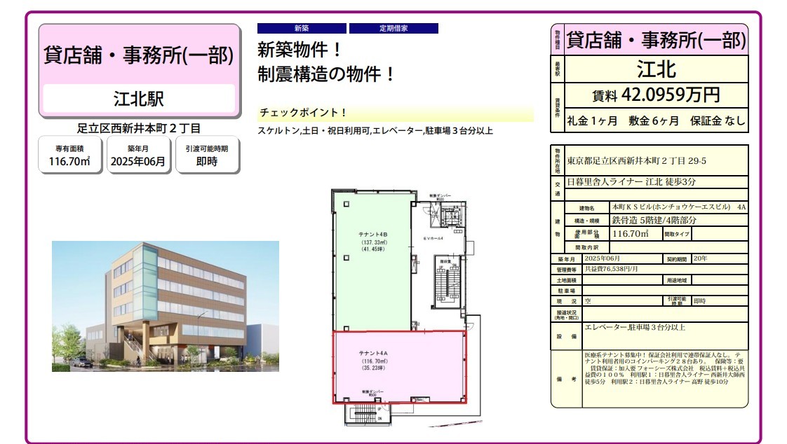 東京都足立区西新井本町2-29-5の賃貸事務所(貸事務所)・貸店舗をお探しのお客様へご案内-このたびは首都圏最大級、貸事務所・貸店舗専門ポータルサイトの東京オフィスMOVEをご利用いただき誠に有り難うございます。事務所移転、飲食店開業や新規独立まで賃貸事務所・賃貸オフィス・貸店舗の仲介実績豊富なスタッフがフルサポート致します。東京都足立区西新井本町2-29-5の大型駐車場付貸事務所、重飲食、美容院や居抜き店舗、レンタルオフィスまで貸事務所(賃貸事務所)、貸店舗を簡単に検索できます!東京都足立区西新井本町2-29-5でSOHO、賃貸オフィス、一棟ビルの貸事務所の貸主・オーナー様には無料にて広告掲載いたしますので是非、お問い合わせください。その他、東京都足立区西新井本町2-29-5で貸事務所・貸店舗をお探しのテナント様にはフリーレント、引越しサービスやオフィスレイアウトもアドバイス出来ますのでご相談ください。