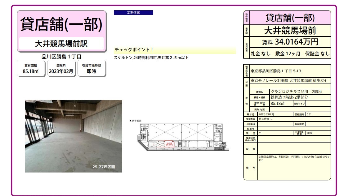 | 備考 | スケルトン24時間利用可天井高2.5m以上 条件交渉ご相談ください。 |