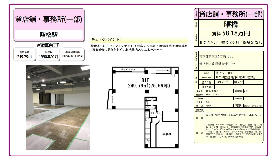 備考 飲食店不可1フロア1テナント天井高2.5m以上耐震構造(新耐震基準) 条件交渉ご相談ください。