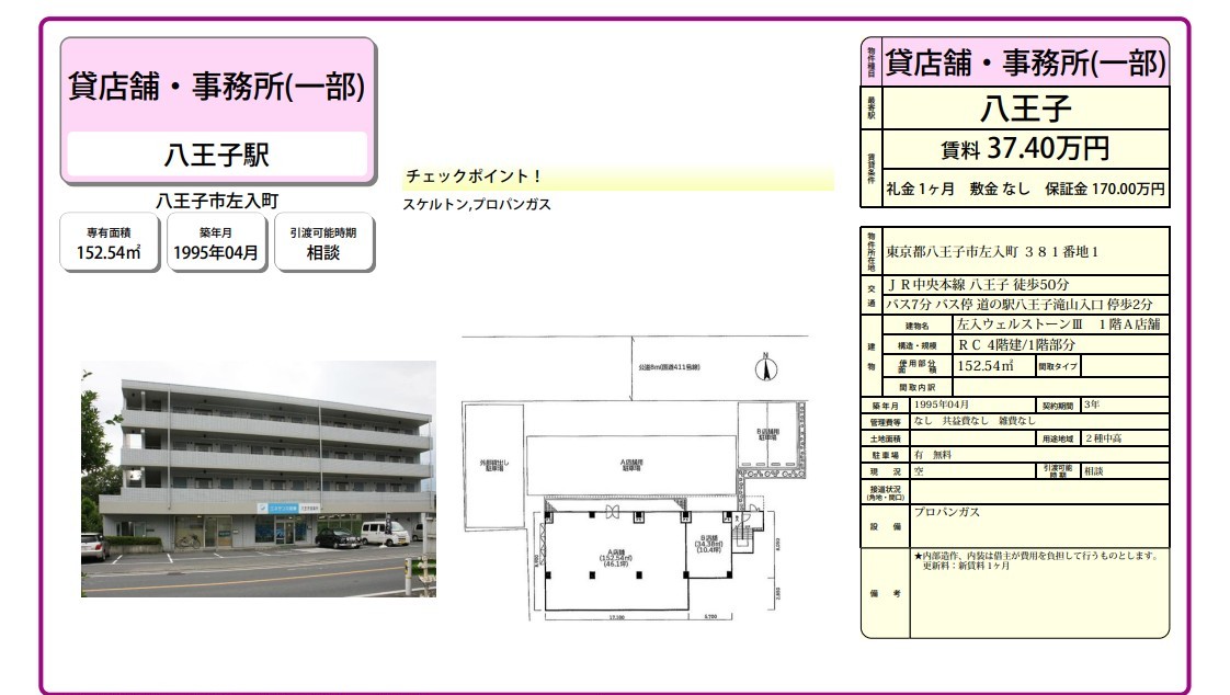 東京都八王子市左入町381番地1の賃貸事務所(貸事務所)・貸店舗をお探しのお客様へご案内-このたびは首都圏最大級、貸事務所・貸店舗専門ポータルサイトの東京オフィスMOVEをご利用いただき誠に有り難うございます。事務所移転、飲食店開業や新規独立まで賃貸事務所・賃貸オフィス・貸店舗の仲介実績豊富なスタッフがフルサポート致します。東京都八王子市左入町381番地1の大型駐車場付貸事務所、重飲食、美容院や居抜き店舗、レンタルオフィスまで貸事務所(賃貸事務所)、貸店舗を簡単に検索できます!東京都八王子市左入町381番地1でSOHO、賃貸オフィス、一棟ビルの貸事務所の貸主・オーナー様には無料にて広告掲載いたしますので是非、お問い合わせください。その他、東京都八王子市左入町381番地1で貸事務所・貸店舗をお探しのテナント様にはフリーレント、引越しサービスやオフィスレイアウトもアドバイス出来ますのでご相談ください。 |